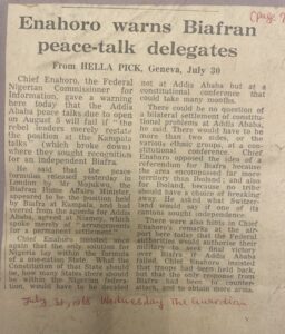 Chief Enahoro was reacting to the Biafran Information Minister, Mr C C Mojekwu’s communique, released in London. Chief Enahoro maintained that all talks were to be held in the belief of a one-nation state of Nigeria and not a bilateral talk with Biafra.