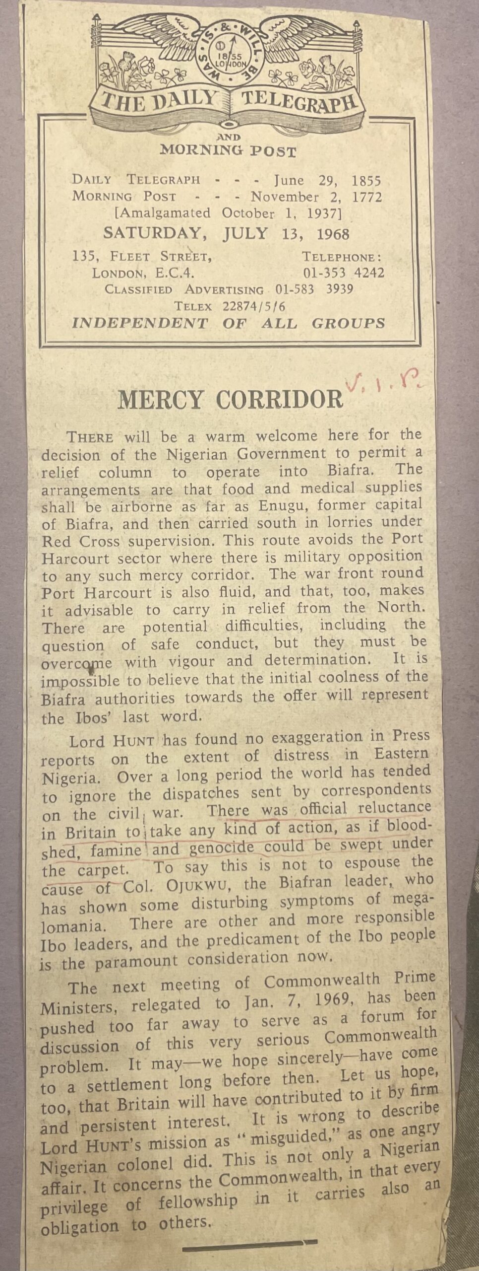 This report in the Telegraph, pointed out that the British High Commissioner; David Hunt – who wasn’t a fan of Ojukwu and Biafra, had actually visited parts of Biafra and confirmed that the starvation story in Biafra wasn’t an exaggerated claim by the Biafran government. This report by Mr Hunt seemed to anger a Nigerian colonel who called the diplomat- misguided.